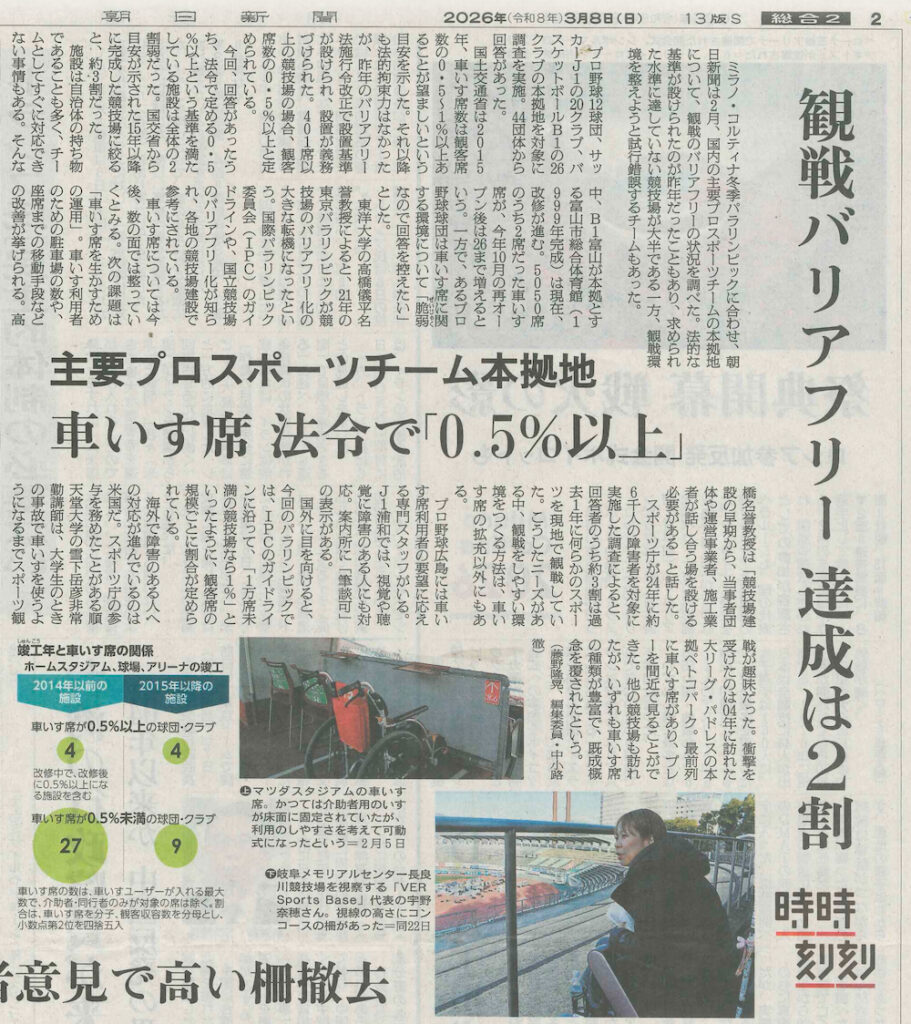 朝日新聞『観戦バリアフリー 達成は2割 主要プロスポーツチーム本拠地』記事にコメント 2026年3月9日 最終更新日時 : 2026年3月9日 manager 3月8日(日)の朝日新聞・朝刊 総合2面『観戦バリアフリー 達成は2割 主要プロスポーツチーム本拠地 車いす席 法令で「0.5%以上」』の記事にコメントが掲載されました。 2026年3月8日 朝日新聞記事の一部(※記事全体は、PDFをご覧下さい) 朝日新聞記事のPDFはこちら 朝日新聞デジタルの記事はこちら