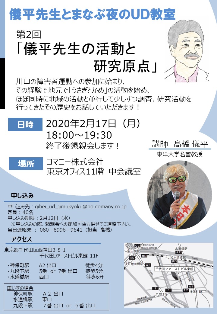 2020年2月17日に「儀平先生とまなぶ夜のUD教室」第2回が開催されました。第2回は「儀平先生の活動と研究原点」と題し、行ってきた研究活動の歴史をお話しました。