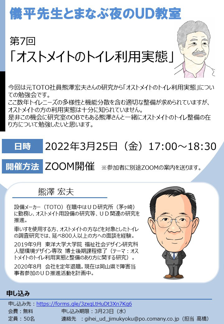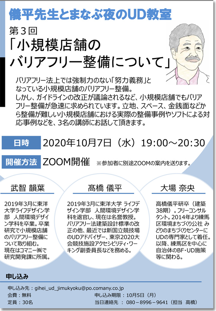2020年10月7日に「儀平先生とまなぶ夜のUD教室」第3回が開催されました。第3回は、リモート(ZOOM開催)で行ない、卒業研究で、このテーマに取り組んだ武智韻葉さんと、自治体のBF・UD施策に関わる大場奈央さんにも加わっていただき、以前調査した渋谷駅や赤羽駅周辺のバリアフリー基本構想地区での小規模店舗のバリアフリー整備についてお話ししました。