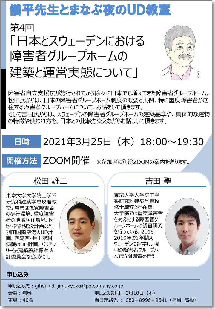 3月25日夜、無事第4回夜のUD教室が終了しました。参加者は秋田から宮崎まで32名でした。設計者、グループホーム運営者、障害当事者、研究者、学生など、とても幅広くあっという間に90分が過ぎました。松田さん、吉田さんの話は分かりやすく、その後の議論も参加された人の熱い思いが伝わる内容でした。