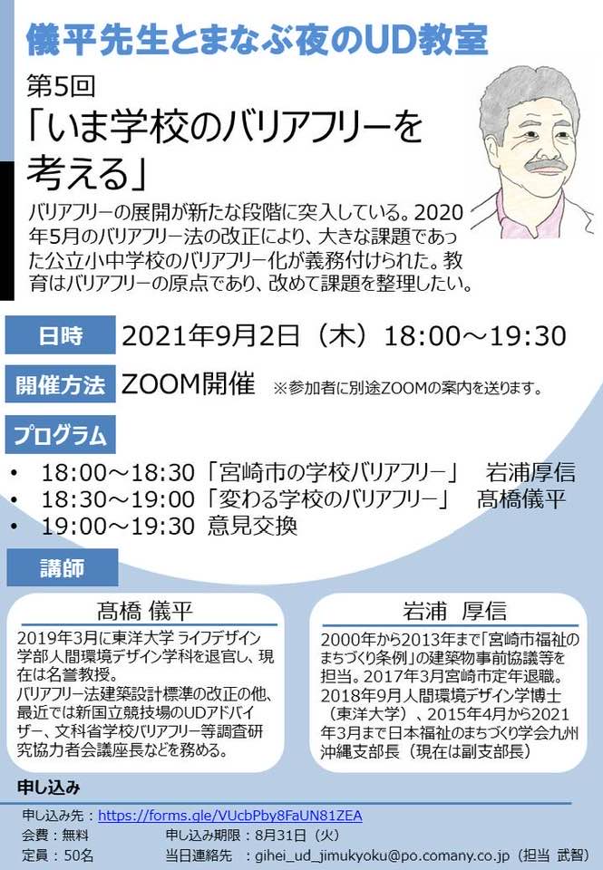 2020年のバリアフリー法の改正によりこれまでの特別支援学校に加えて通常の学校がバリアフリーの義務化対象施設となった。しかし殆ど既存の学校であり、改修費用が膨大になるからすんなり進むかどうか不透明。国も国庫補助率をアップしてエレベータの設置などを推進しているが市町村の動きが良くない。岩浦さんから宮崎市の学校長寿命計画におけるバリアフリー化と当事者参画の交渉経過を詳細に報告いただいた。2022年度に計画の見直しが予定されているとのこと。