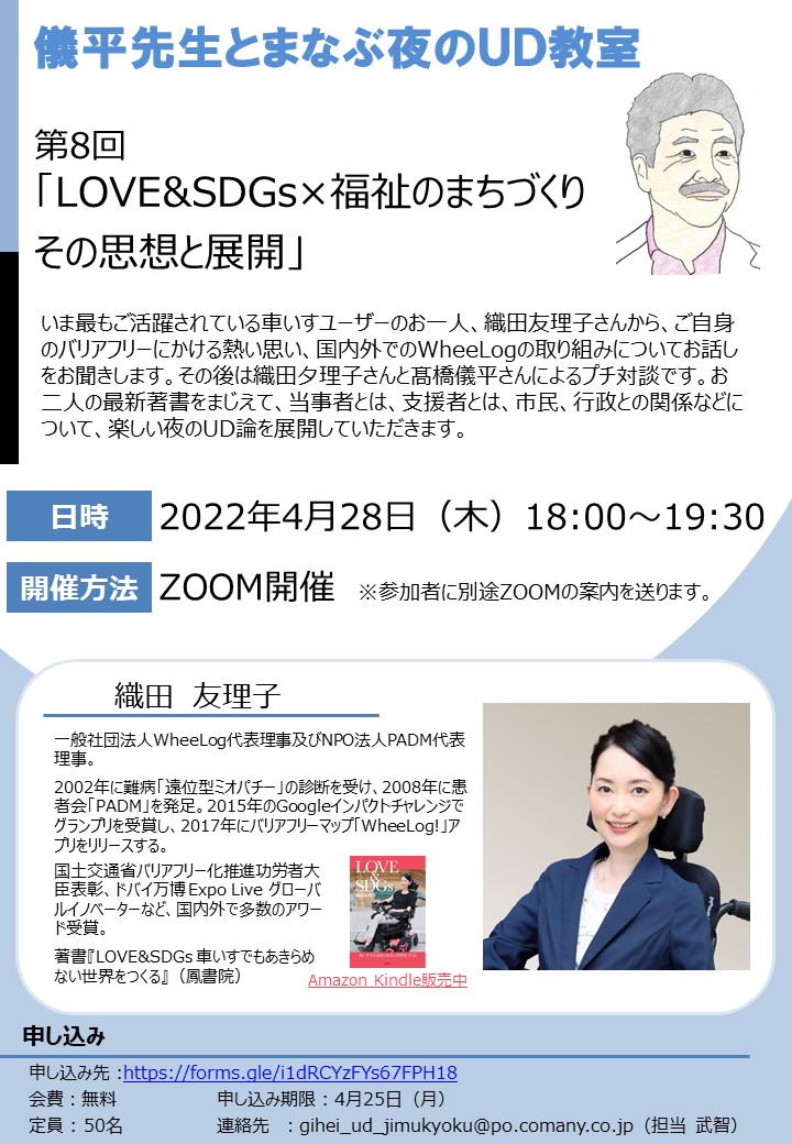 第8回が終了しました。最初に織田さんが今抱いているあきらめない夢を中心にWeelogのみんなで作る「バリアフリーマップ」の活動についてお話をお聞きしました。後半の対談では、夫であり、介助者でもある洋一さんとの関係、日本と海外のバリアフリーの違いや市民意識の違い、日本の良いところ、これからの可能性についても話が弾みました。