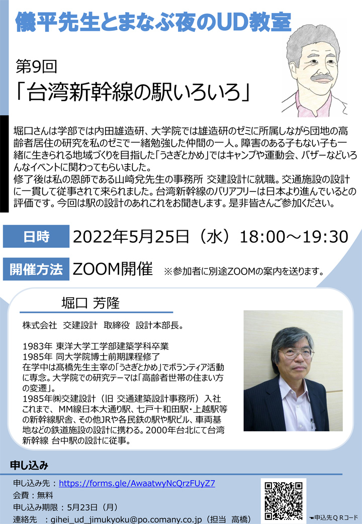 今回は1983年から研究室に出入りしていた堀口君(正確には学部ゼミ生ではなく大学院時に修論指導)のお話。修了後は私のボスであった山崎兌先生の交建設計に入社。東北新幹線の駅や民鉄駅舎等の設計に関わられた。2年前の2020年5月NHKドラマで「路(ルウ)~台湾エクスプレス~」が放映され、2022年2月にBSで再放送された。堀口君はその初期の1999年から2000年にかけて台湾新幹線台中駅の基本設計に関わられた。全12駅の紹介と当時の苦労話、特に欧米のクライテリアと日本の基準との相克、四六時中惜しみなく働く日本人と異なる地元のスタッフ、我が国の今日的テーマでもある。今回はシークレット内容も多く含まれていたため、「研究室」のゼミ的開催とした。後発組の台湾新幹線車両は日本の車いすユーザーにとても評判が良いのであるが、駅舎空間もとてもゆったりとしている。